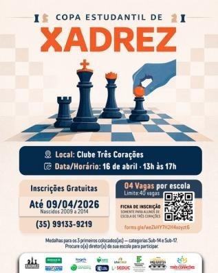 No próximo dia 16 de abril, sexta-feira, das 13 horas às 17 horas, acontecerá a COPA ESTUDANTIL DE XADREZ, que temcomo Coordenador o Professor tricordiano – Anderson Herculano. As inscrições serão Gratuitas, aos alunos das Escolas sediadas em Três Corações, nascidos em 2009 a 2014, e poderão ser feitas até o próximo dia 09 de abril.